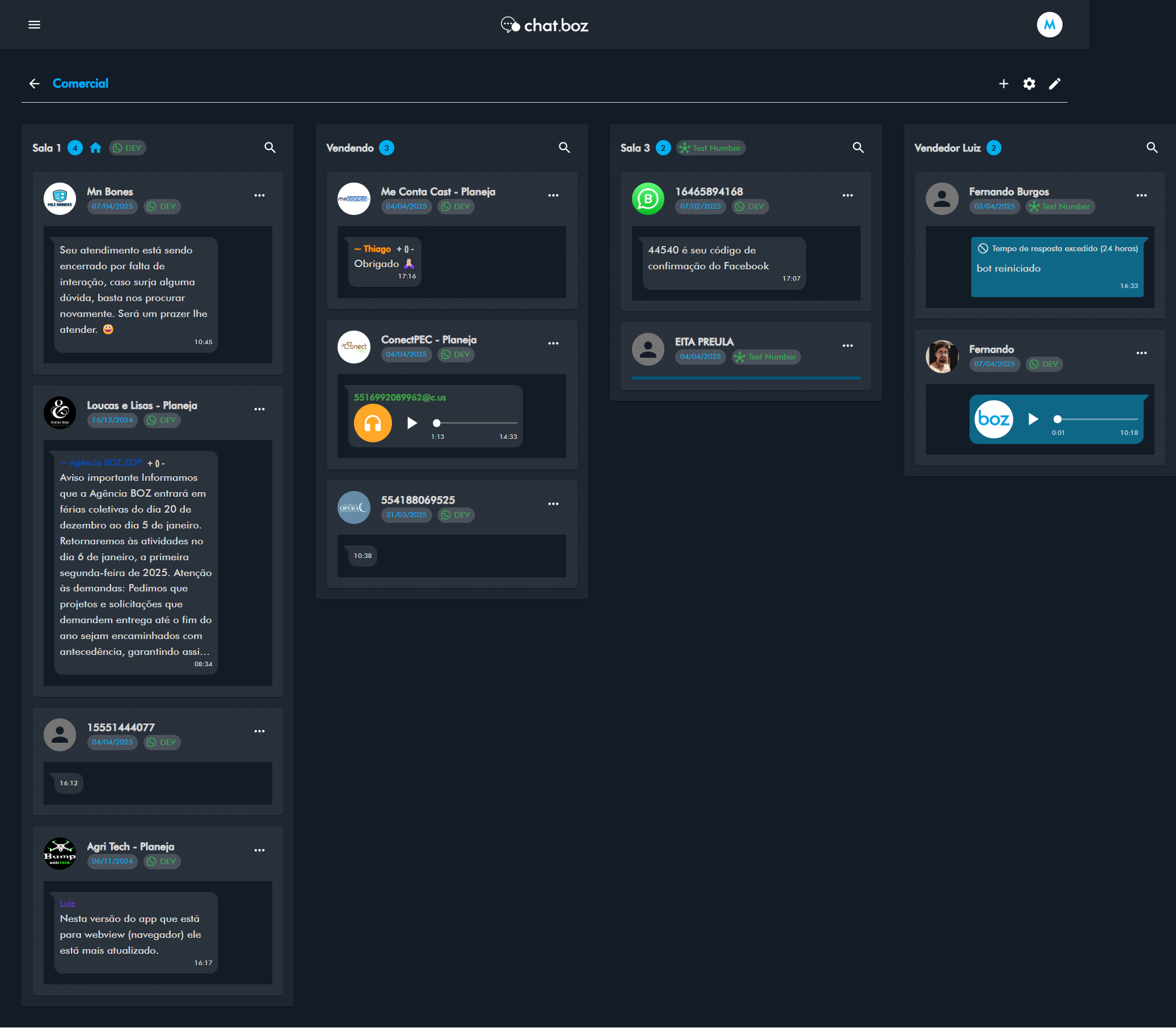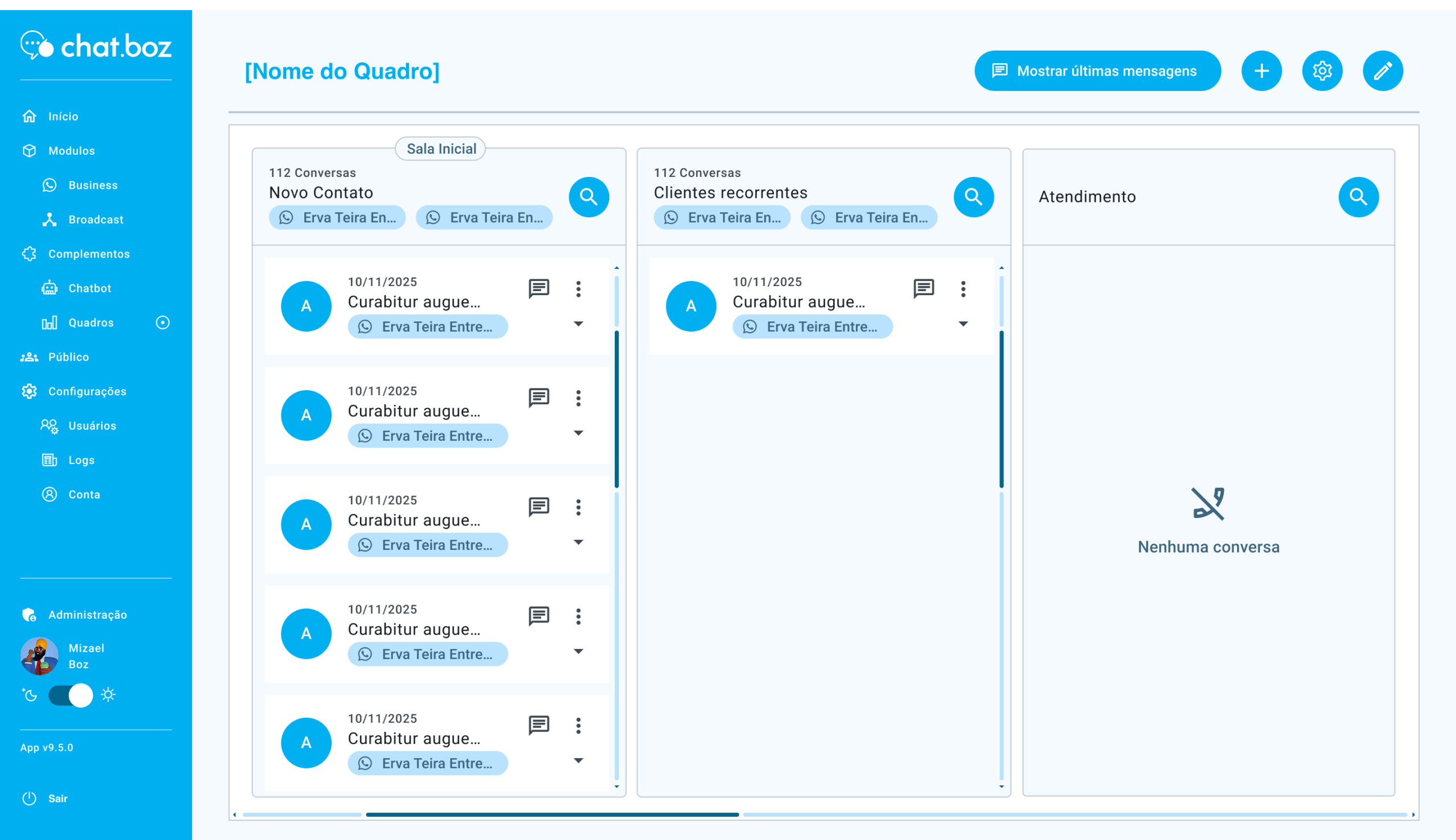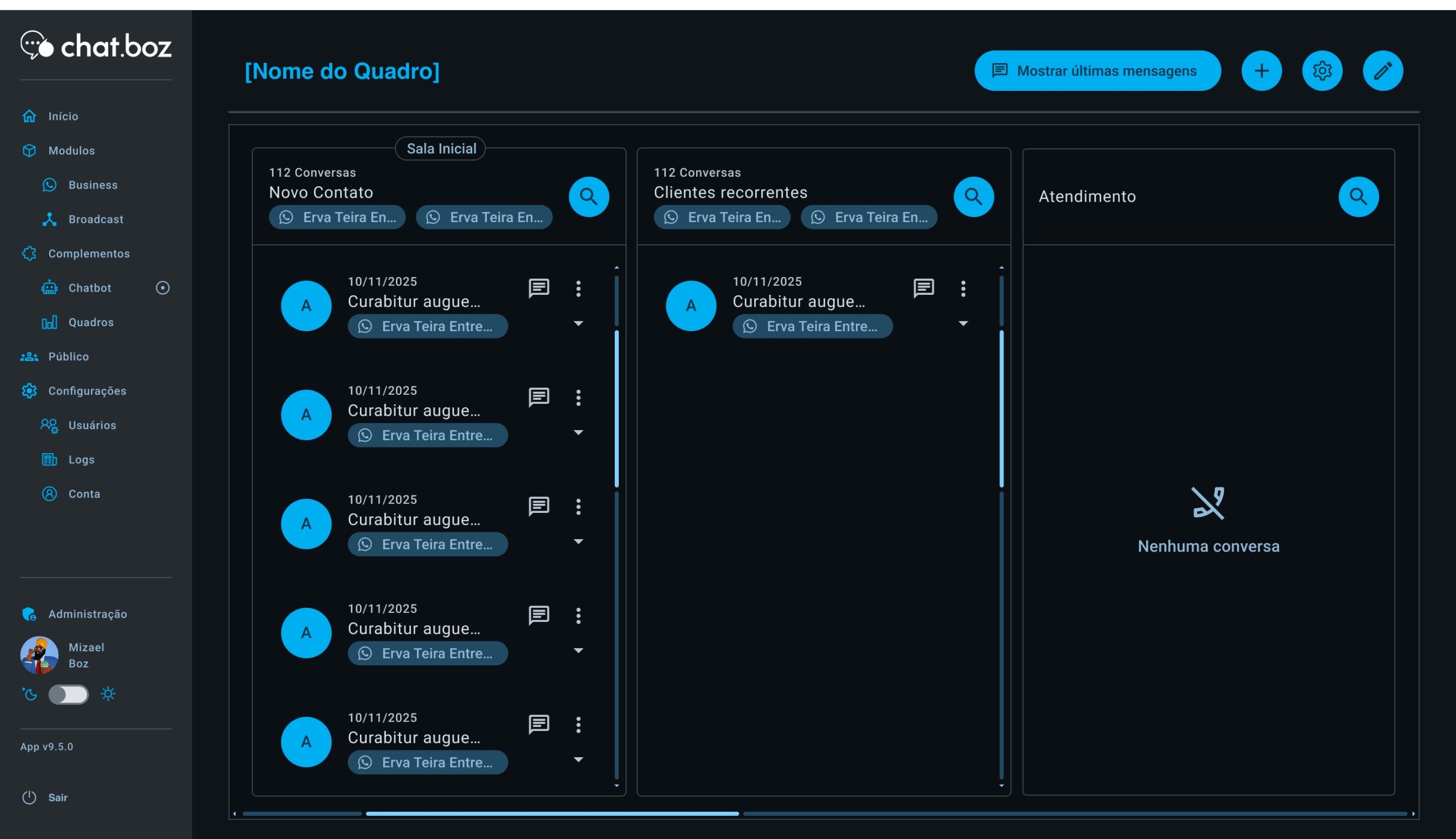 Quadros (Kanban) panorâmicos ilimitados para organização de conversas.